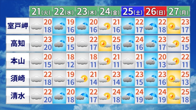 今週は前線の影響で、雲が広がりやすく、22日は高知市でも20度を下回る見込みです。週末は低気圧で傘の出番があるでしょう。