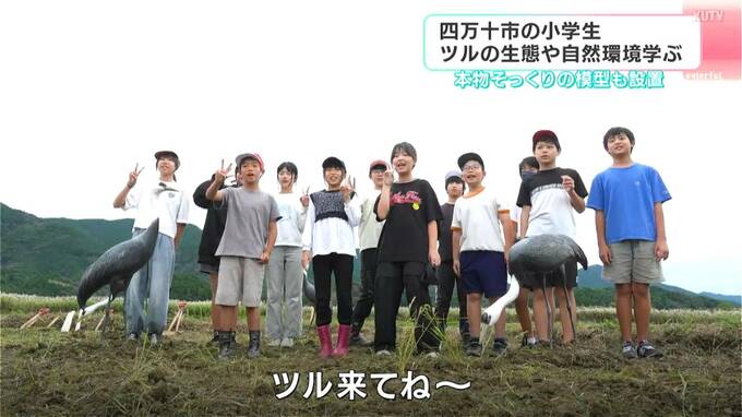 四万十市に飛来するツルの保護活動を行う「四万十つるの里づくりの会」は毎年、学習会を開いていて、2025年で20回目です。参加した東中筋小学校の5・6年生12人は、座学でツルの生態や越冬するために必要な自然環境などを学びました。その後、えさ場となる田んぼに移動し、ツルが安心して過ごせるよう「デコイ」とよばれる本物そっくりの模型4体を設置しました。ツルは群れで行動する習性があり、上空を飛ぶツルが仲間がいると思って降り立つとされています。