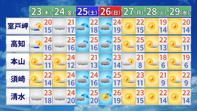 23日の高知県内は、高気圧の影響で日中を中心によく晴れるでしょう。西部では午前の早い時間は雲が残りやすくなりますが、次第に日差しが届く見込みです。