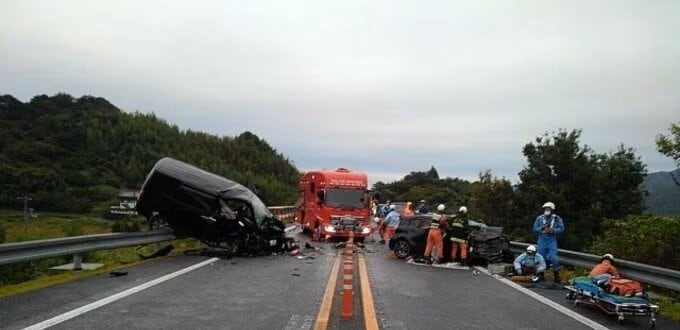 事故直後の画像からは、正面衝突した乗用車が2台とも原型を留めないほど大破し、片方の車は衝撃でガードレールに乗り上げているのがわかります。