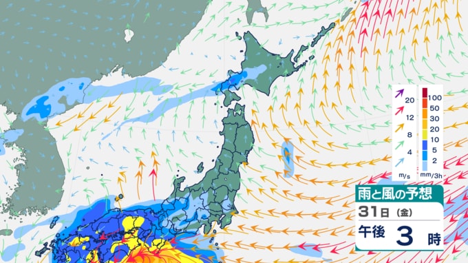 週末は爆弾低気圧で大荒れ予想 北海道など特に北日本は暴風に警戒、大雨に十分注意 さらに台風のたまご(熱帯低気圧)が発生予想 【雨風シミュレーション】 2025年10月31日(金) 07:00 国内 天気 31日雨風シミュレーション