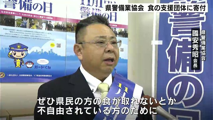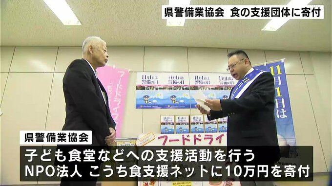 県警備業協会では例年、11月1日の「警備の日」に合わせて警備業に関する理解や信頼を深めてもらおうと広報活動を行っています。2025年はお年寄りや子どもたちにお腹と心を満たしてもらいたいと、子ども食堂などへの支援活動に取り組んでいるNPO法人、「こうち食支援ネット」に10万円を寄付しました。寄付された10万円は食材の購入費用などにあてられるということです。