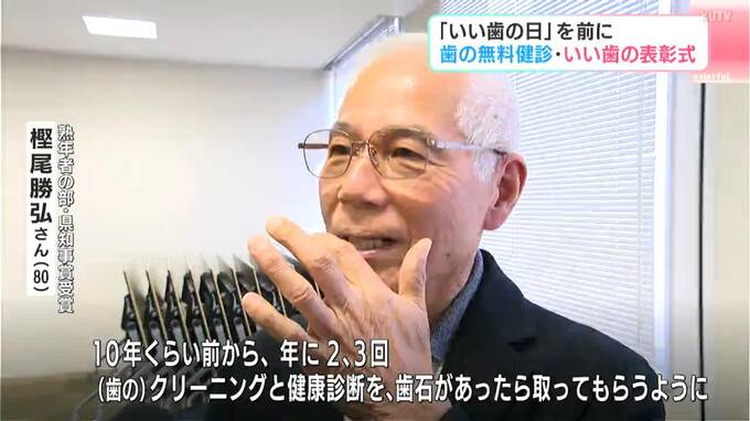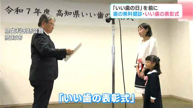 また3日は「いい歯の表彰式」が高知市で行われました。健康な歯や歯ぐきを維持している人たちを県や県歯科医師会などが毎年表彰していて、親と子の部は4175組の中から18組が、熟年者の部では45人の中から20人がそれぞれ表彰されました。