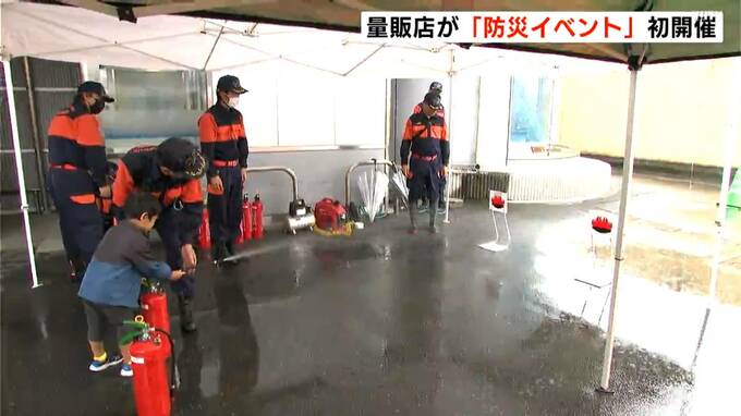 訪れた買い物客は訓練用の水消火器を使って的を倒して消火活動を体験したり、火災発生時の煙を再現したテントの中に入って視界の悪さを確認したりしました。
