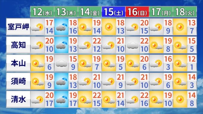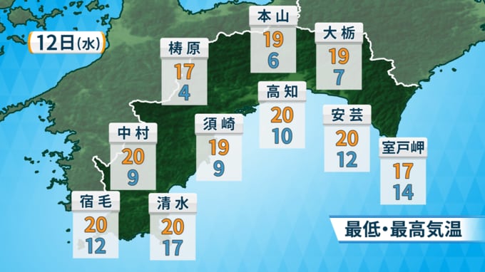 12日の高知県内は、気圧の谷や湿った空気の影響で概ね雲が広がりやすい一日となりそうです。西部ではより日差しが少なく、午前中から雲が多い空模様となるでしょう。
