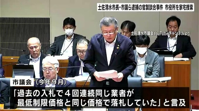 官製談合防止法違反などの疑いで高知県土佐清水市の市長や市議らが逮捕された事件で高知県警は11日夜、土佐清水市役所を家宅捜索しました。県警は午後4人を送検し、贈収賄も視野に捜査を進める方針です。また、市発注の工事を巡っては過去に議会でも、最低制限価格と落札結果について言及されていました。