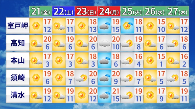 21日の高知県内は、高気圧に覆われて広い範囲でよく晴れるでしょう。一日を通して雨の降るところはなさそうです。