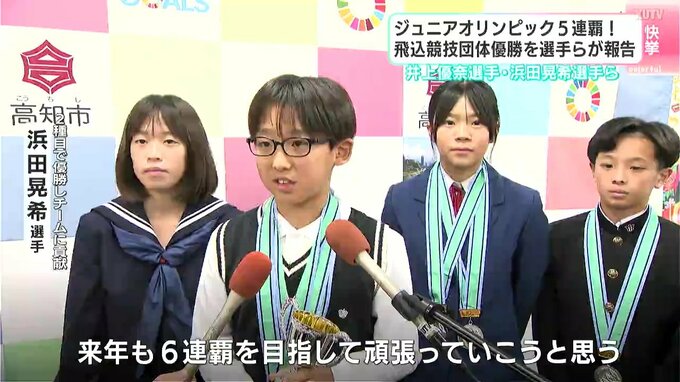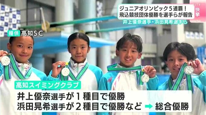 高知スイミングクラブの総合優勝は今回で5年連続です。選手たちは大会優勝の喜びを報告したほか、「高いところは怖くないですか」という質問に、練習で何本も飛び込むことで克服していると答えていました。