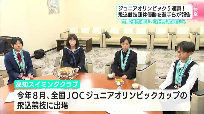 桑名市長を訪れたのは高知スイミングクラブの選手4人とコーチです。選手たちは、2025年8月大阪で行われた全国JOCジュニアオリンピックカップの飛込競技に出場。土佐女子中学校3年生の井上優奈選手が飛板飛込で優勝したほか、春野東小学校6年生の浜田晃希選手が2種目で優勝するなどし、出場した36団体の中で、総合優勝を果たしました。