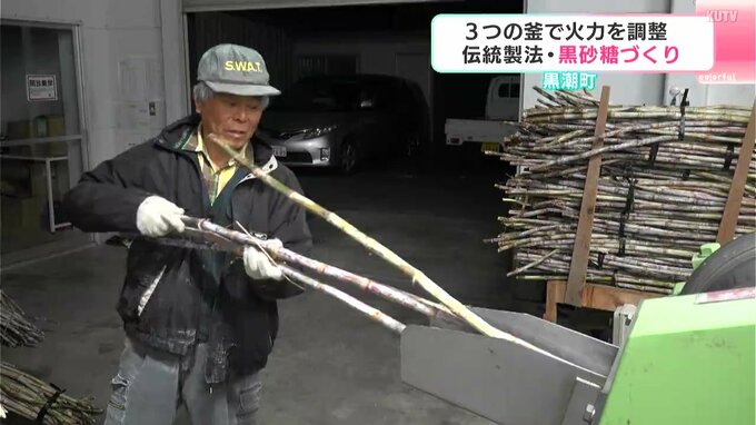 午前3時。黒潮町入野にある加工施設で行われたのは機械を使ってサトウキビの汁を搾る作業です。生産者グループ「入野砂糖研究会」は特産の黒砂糖の製造を20日から始めています。