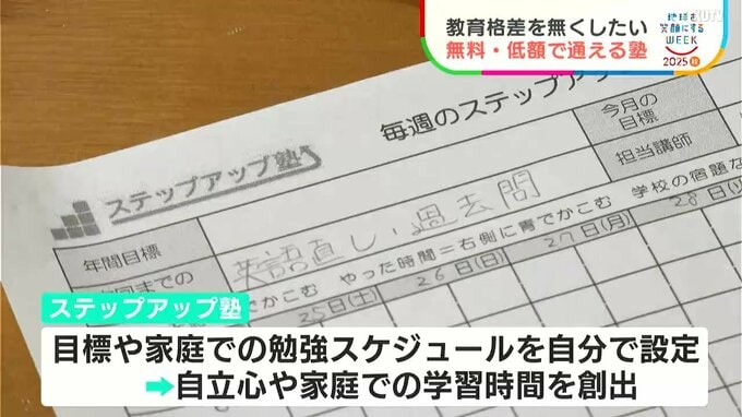 文部科学省によりますとこれまでの調査で、世帯収入は学力に影響を及ぼすことが示されています。ステップアップ塾は寄付金や助成金で運営されていて、月額は保護者の所得により異なりますが、無料から最大で4000円まで。現在、18人が通っています。学習スタイルはボランティアの高校生や大学生から個別に教わる「マンツーマン指導」です。