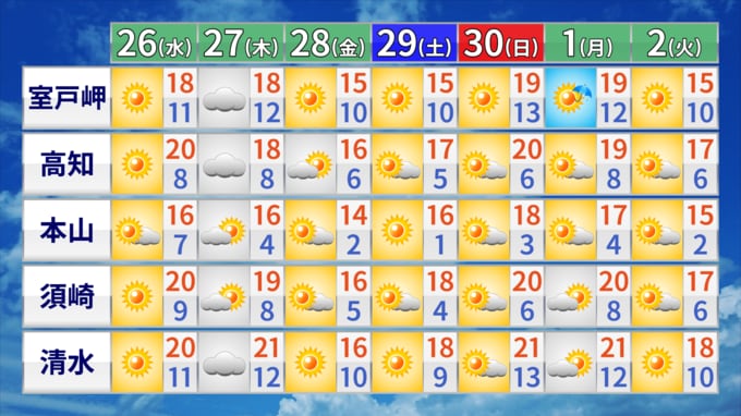 26日の高知県内は、高気圧に覆われて一日を通してよく晴れそうです。