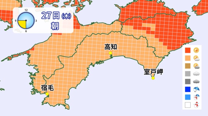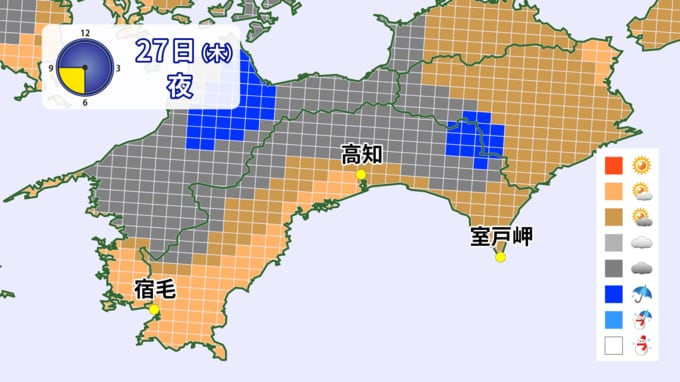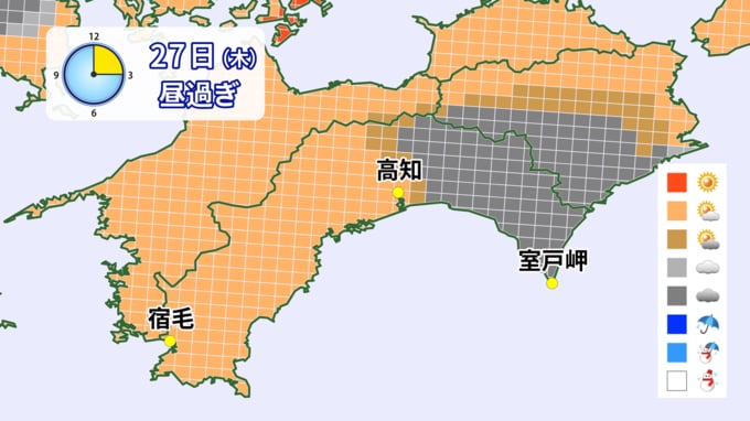 27日は、湿った空気の影響で雲が広がりやすい空模様となりそうです。午後からは降水確率は40%とそこまで高くはないものの、大気の状態が不安定となり東部では雨や雷を伴う所がありそうです。急な強い雨、竜巻などの突風、落雷に注意をしてください。