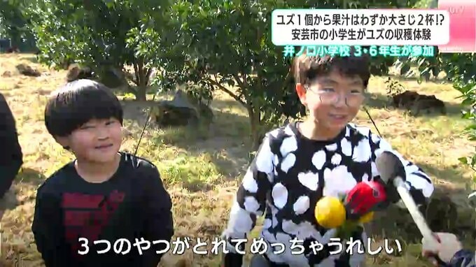 収穫を体験したのは安芸市の井ノ口小学校の3年生と6年生、およそ30人です。県内で生産量1位を誇る安芸市のユズに親しみを持ってもらおうと、地元の梶原建設が、2024年から始めました。ユズは枝にたくさんトゲがあるため、子どもたちは実に傷がつかないように丁寧に収穫していました。