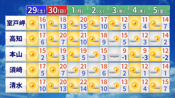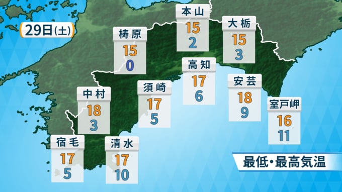 朝の最低気温は前日よりも低くなるところが多く、四万十市中村では3℃(前日差-9℃)となる見込みです。日中は広い範囲で平年並みとなる見込みで、朝と昼の寒暖差が目立つ一日となるでしょう。服装でうまく調節をして、体調管理に努めてください。