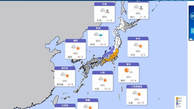 4日と5日は強く冷え込み、最低気温は東京や大阪で4度の見込みです。すでに冬物を着ている方もいると思いますが、まだの方は厚手の上着や手袋などをすぐ出せるよう、準備しておくとよさそうです。