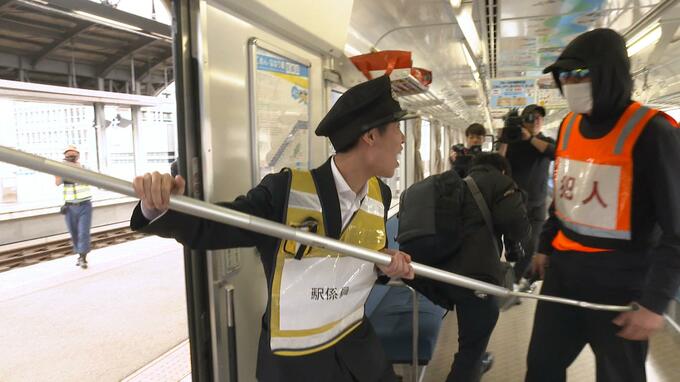 訓練では、車掌が乗客を避難させた後、駅員が「さすまた」を使って警察が到着するまでの間を対応します。そして通報を受けた警察官が駆けつけ、列車に突入し、不審者を取り押さえました。