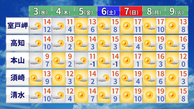 向こう1週間は晴れる日が多くなりそうです。4日以降は、本格的な寒気が県内には流れ込み山沿いでは冬日が続くところがあるでしょう。来週の前半気温は持ち直し、20℃近くまで上がるところがありそうです。