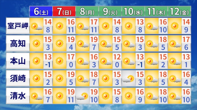 6日の高知県内は、移動性高気圧の影響で広い範囲で日差しが届くでしょう。風も穏やかな時間が多く行楽日和、洗濯日和となりそうです。
