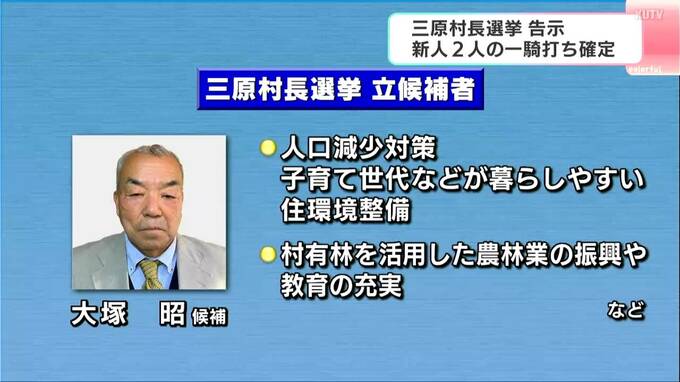 大塚候補は三原村出身の74歳で、証券会社に勤務した後、高知県内の小学校の校長や、三原村森林組合の組合長などを務めました。人口減少対策として子育て世代などが暮らしやすい住環境整備を行うほか、村有林を活用した農林業の振興や、教育の充実などを訴えています。