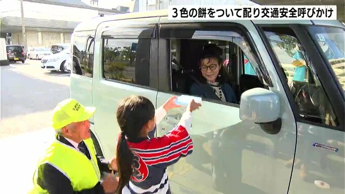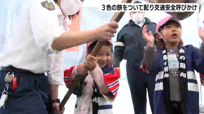 年末年始の交通安全運動にあわせて、園児や警察官らが3色の餅をついてドライバーに配り、交通安全を呼びかけました。