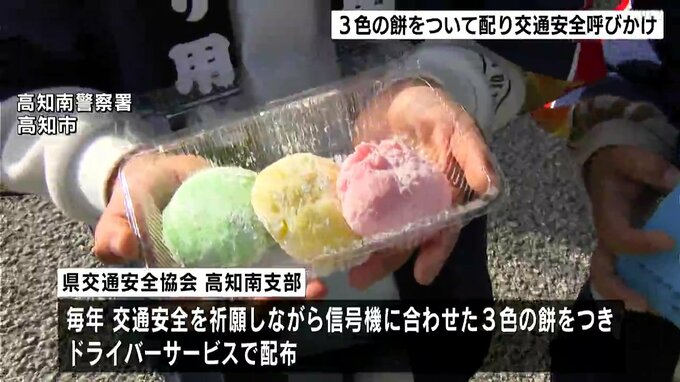 県交通安全協会高知南支部は毎年、交通安全を祈願しながら信号機の色に合わせた3色の餅をつき、ドライバーサービスで配布しています。