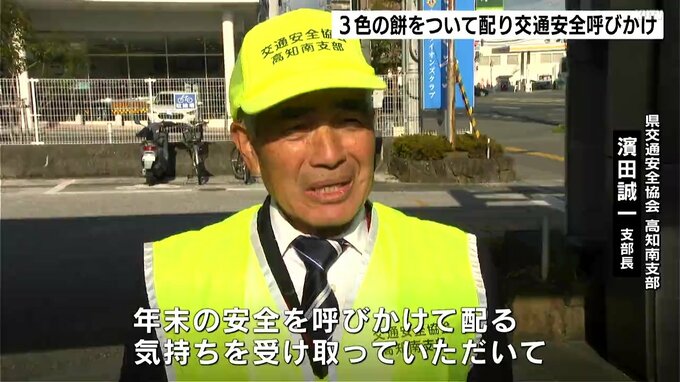 餅つきには潮江双葉園の園児と高知南警察署の警察官、合わせておよそ40人も参加しました。力を合わせて3色の交通安全餅をついたあと、警察署の前を通るドライバーに配り、交通安全を呼びかけました。