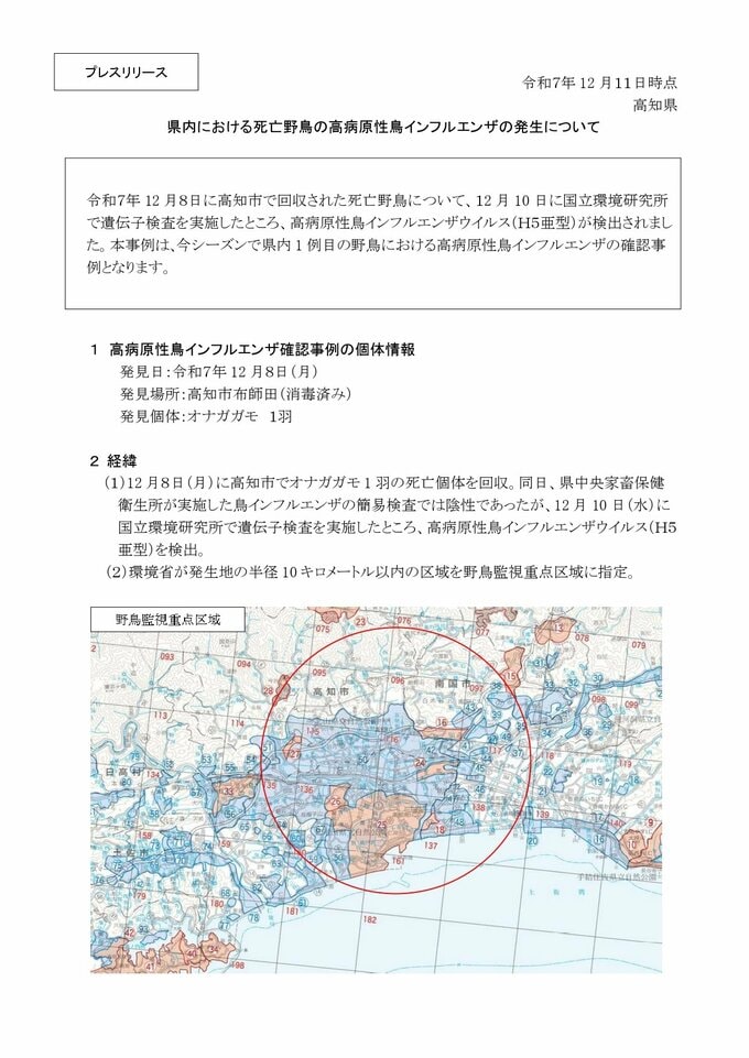 高知県は11日、県内で見つかった死んだ野鳥から「高病原性鳥インフルエンザウイルス」が検出されたと発表しました。高知県内では今シーズン初の、野鳥の鳥インフルエンザの確認事例です。