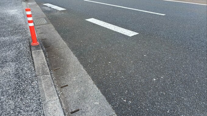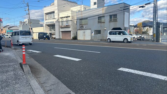 現場は高知市旭町の国道33号で、道路中央に路面電車の軌道があり、片側2車線の車道の幅が狭くなっていく場所です。