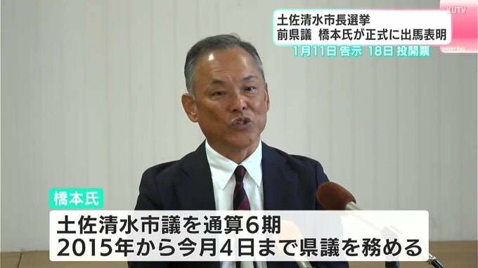 橋本氏は土佐清水市出身の67歳で、土佐清水市議会議員を通算6期務めた後、2015年から12月4日まで県議会議員を務めました。