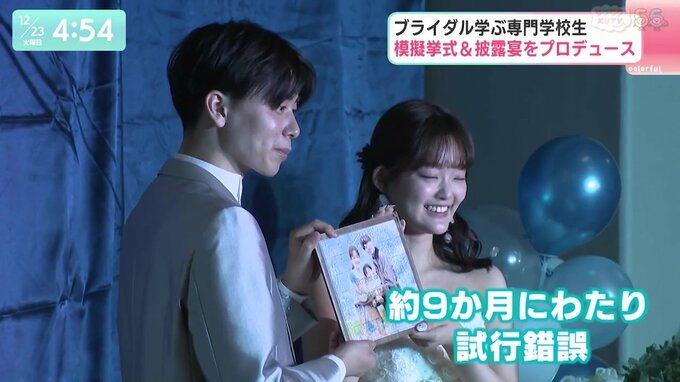 ブライダルを学んできた専門学校の生徒たちが、卒業制作として模擬挙式と披露宴を行いました。構成、演出など、全てをプロデュース。「人々の幸せを手伝う」という将来の夢に向けた、2年間の集大成です。
