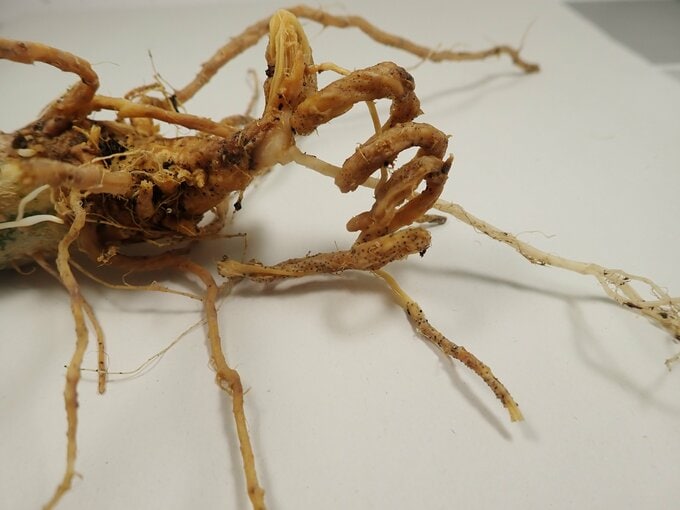 農業技術センターで詳しく検査したところ、根の表面に多数の小さな黒い点が確認され、「キュウリ黒点根腐病」と判明しました。この病気は、収穫期ごろから地上部分にしおれの症状が出始めます。