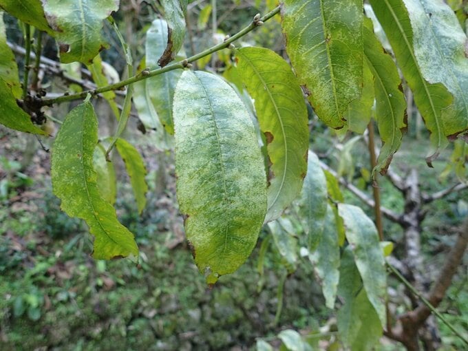 被害を受けた葉は、色が徐々に薄くなり、全体が吸われると白くカスリ状になって、ひどい場合は早期に落葉してしまいます。