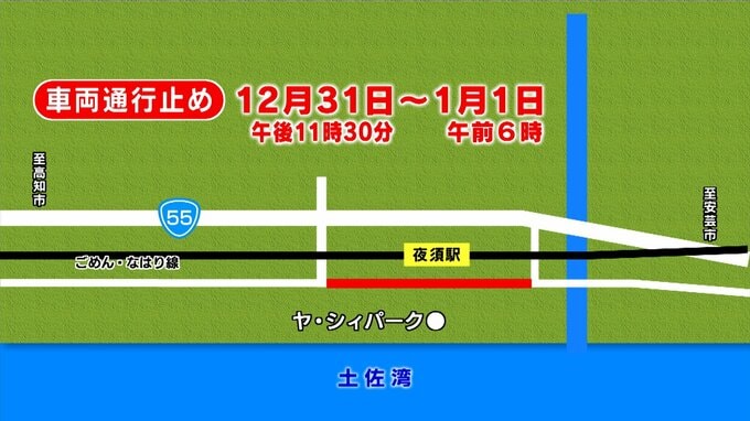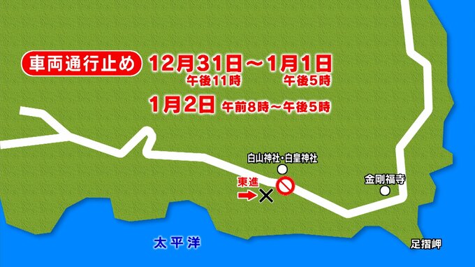 土佐清水市では、31日午後11時から1日午後5時まで、県道足摺公園線の白山(はくさん)神社前で東進する車両が通行止めとなります。規制は2日も午前8時から午後5時まで実施されます。