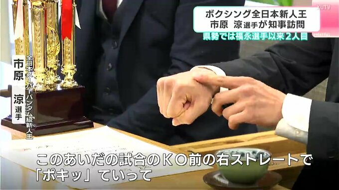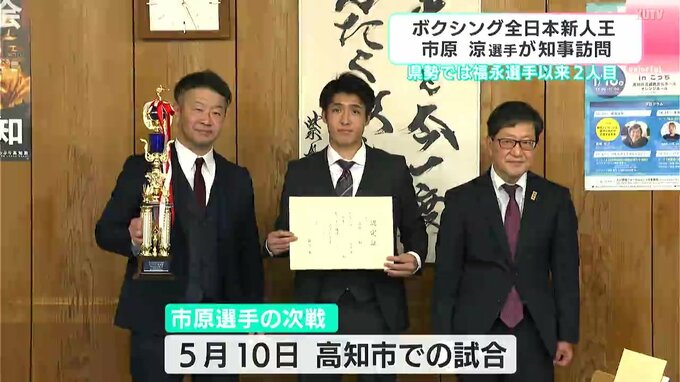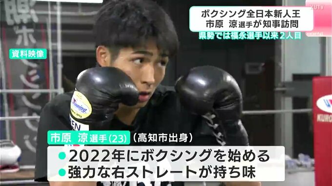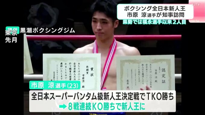 濵田知事を訪れたのは、黒潮ボクシングジム所属の市原涼選手です。高知市出身の市原選手は、2022年にボクシングを始めました。左右のパンチにキレがあり、特に右ストレートは強力です。2023年10月のデビューからプロ6戦6KO勝ちを収め、2025年9月、西日本新人王になると・・・。