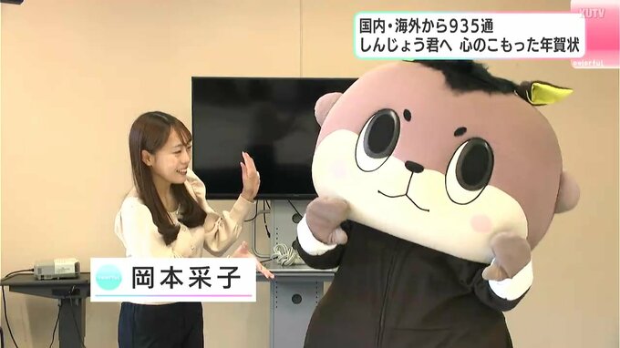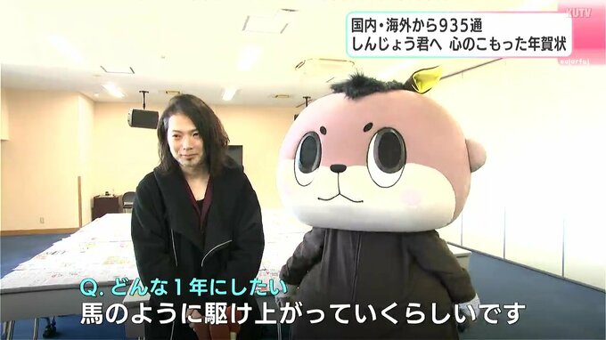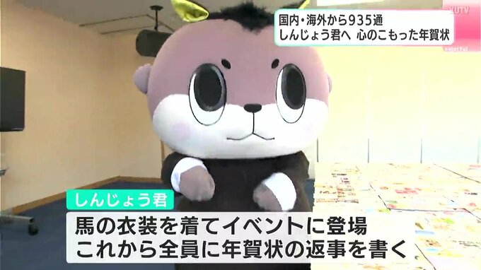 2026年の干支、「馬」にふんして登場したしんじょう君。年賀状の交換は2014年から行っていて、2026年は、935通が届いたということです。国内だけでなく、5つの国と地域から届いていて中でも、ドイツからは初めて。年賀状離れが進む中、しんじょう君への年賀状は手書きのものが多く、1枚1枚にあたたかいメッセージが添えられています。