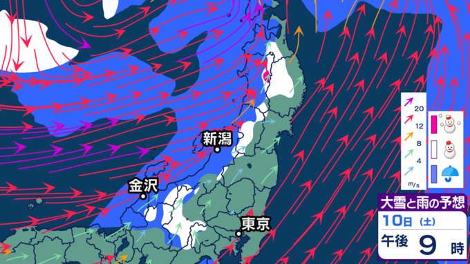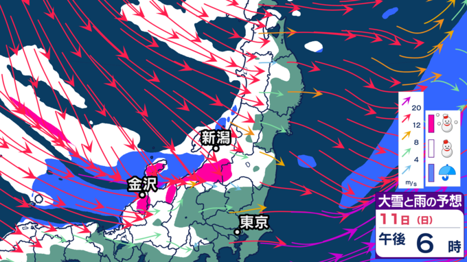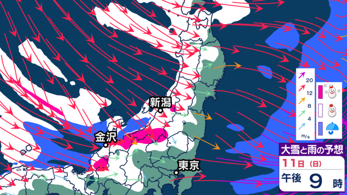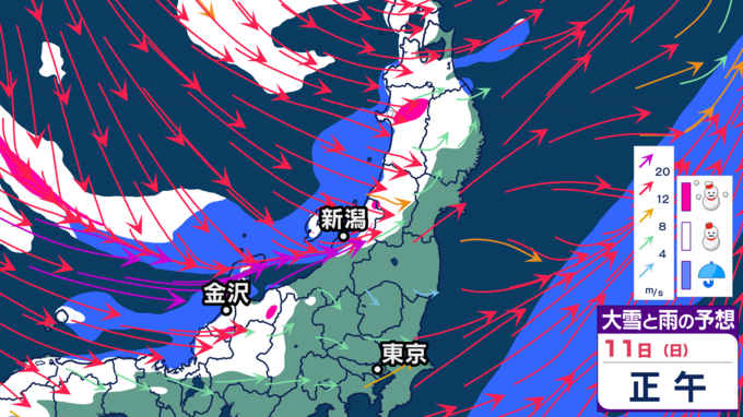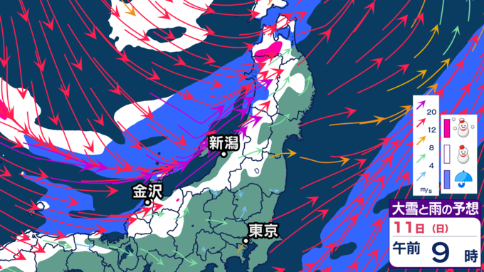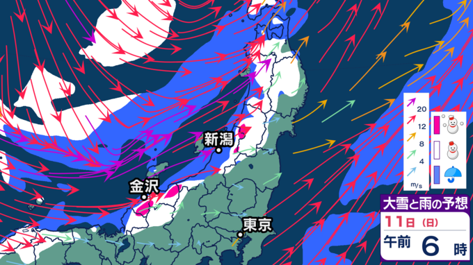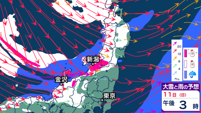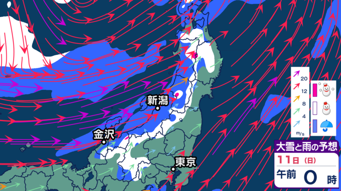 【大雪情報】11日・12日、東北地方では100センチの大雪の恐れ 雪の降り方はどこで・いつ強まるか? 2026年1月10日(土) 20:12 国内 天気 【11日雪シミュレーション】 新潟県、富山県、福井県、長野県北部、群馬県北部などで特に雪の降り方が強まり、大雪となる見込みです。警報級の大雪となる恐れがありますので、最新の気象情報を確認するようにしてください。