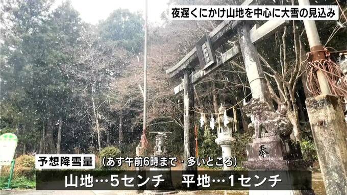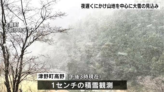 津野町高野では11日午後3時現在、1センチの積雪を観測しています。県内では11日の夜遅くにかけて山地を中心に大雪となり、平地でも大雪となる所があるでしょう。