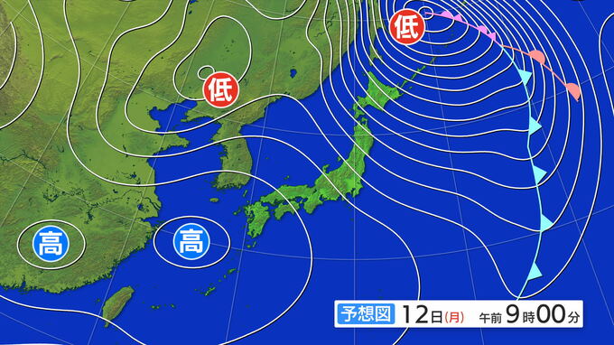 12日の予想天気図をみると、引き続き強い冬型の気圧配置となる予想です。そのため、まだ北寄りの風が強まり、厳しい寒さも続きそうです。
