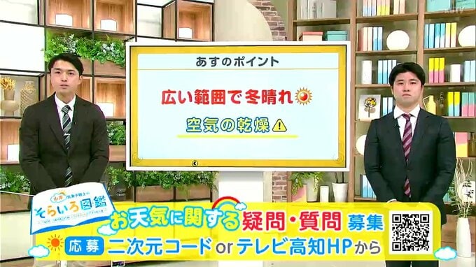 高知の天気 14日 広い範囲で冬晴れ 空気の乾燥に注意 山岸拓気象予報士が解説 2026年1月13日(火) 19:38 国内 天気 14日の高知県内は、高気圧に覆われて概ね晴れるでしょう。日中の最高気温は平野部では平年並みのところが多くなりますが、山沿いでは平年のこの時期よりも高く、10℃を上回るところもある見込みです。朝と昼の寒暖…