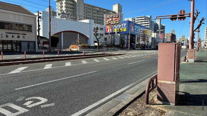 現場は、路面電車が通る市街地の国道32号で、とさでん交通・知寄町電停すぐそばの片側2車線の道路上です。