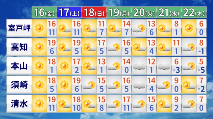 来週の前半までは平年よりも過ごしやすい気温となりますが、来週の後半からは寒気の影響で日中も寒さが戻ってくる見込みです。一日の寒暖差に加えて前日との寒暖差も大きくなるでしょう。空気の乾燥は連日続く見込みで、火気の取り扱いにも注意が必要です。