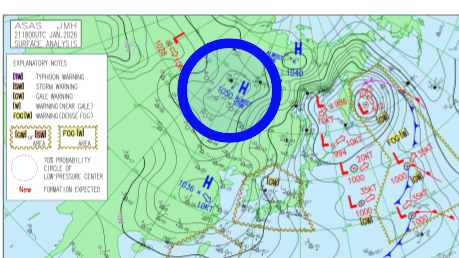 シベリア大陸には、1050hpaの高気圧が発生しています。これは寒冷高気圧といい、冷たい空気で生成されたものです。冷たい空気は重いため、この寒冷高気圧は動きが遅く停滞することが特徴の1つです。この影響で日本に寒気が長く流れ込み、雪の降る日も長続きするとみられます。