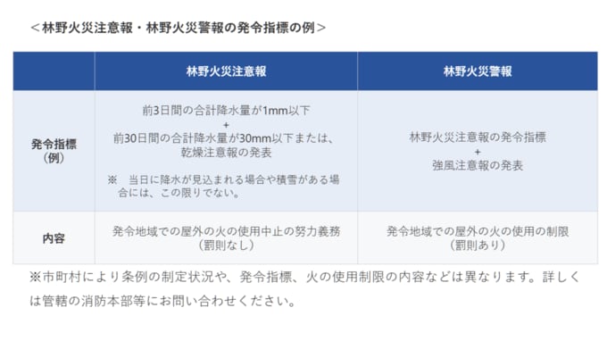 林野火災注意報・警報が発表された場合、その地域では屋外での火の使用が以下のように制限され、警報発表中に違反した場合は罰則に課せられることがあります。
