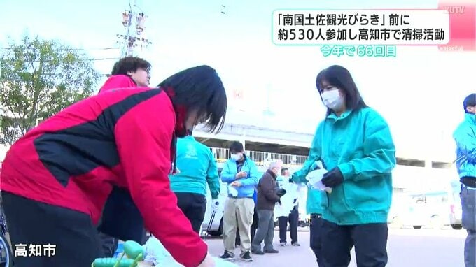 2026年で66回目を迎える南国土佐観光びらき清掃。雲一つ無い青空の下、県や市の職員、県内の企業の社員らおよそ530人が高知市中心部や桂浜で清掃活動を行いました。
