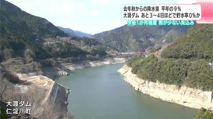 「ほぼ最悪の状況」2025年秋からの降水量が平年の9%…あと3~4日ほどで貯水率0%か 高知・大渡ダム 2026年1月29日(木) 18:18 国内 暮らし・マネー 高知県内は雨が少ない状態が続いています。仁淀川町の大渡(おおど)ダムは、あと3日から4日ほどで貯水率が0%になるということです。現状を取材しました。◆四国地方整備局 大渡ダム管理所 伊藤道啓 専門官「の…