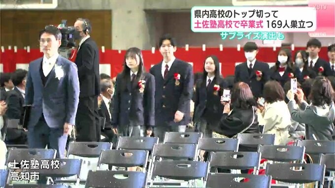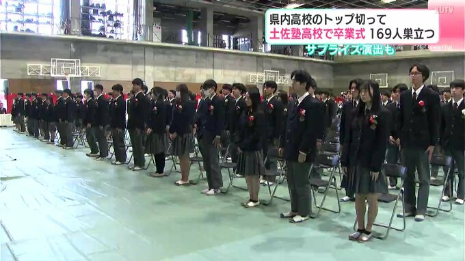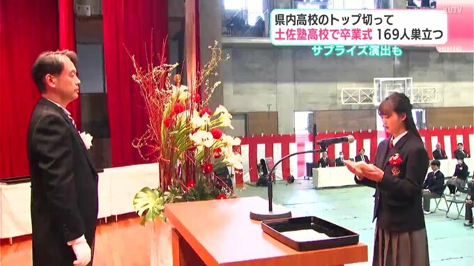 卒業の日を迎えたのは土佐塾高校の37期生、169人です。一人ずつ名前を呼ばれた後、クラスの代表が卒業証書を受け取りました。式では草鹿広(くさか・ひろし)校長が「命を大切にしながらさまざまなことに取り組んでほしい」と式辞を述べた後、卒業生代表の澤本紀良々(さわもと・きらら)さんが感謝の気持ちを伝えました。