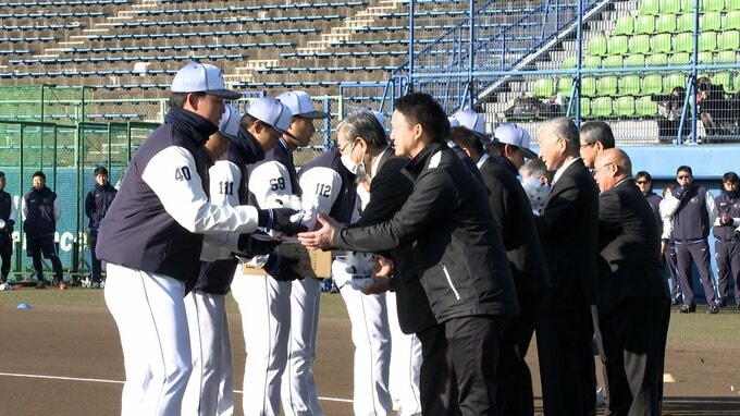 1日は、キャンプの練習開始を前に「歓迎セレモニー」が開かれ、選手たちに高知県産の果物や飲み物などが贈られました。