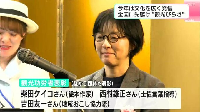 高知市観光協会は全国に先駆けて毎年この時期に観光びらきを行っています。式典では観光への功労者が表彰され、「ぼうしパン」をモチーフにしたキャラクターを作り、観光プロモーションに尽力した絵本作家の柴田ケイコさんが表彰されました。
