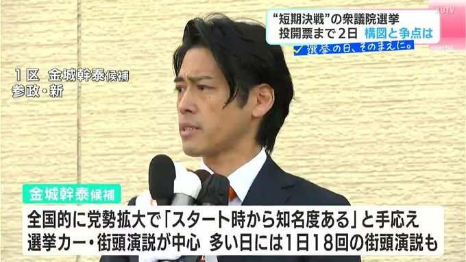 参政党・金城さんは2025年の参議院選挙に続き2度目の国政選挙。全国的に党勢が拡大する中「今回はスタート時から知名度がある」と手ごたえを感じていて、選挙カーや街頭演説での訴えが中心です。多い日には1日18回、街頭演説を行い、「消費税の減税(廃止)やインボイス制度廃止で労働者の所得・賃金を上げていく」などと訴えています。